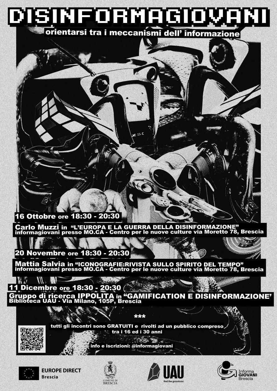 Disinformagiovani è un ciclo di talk serali per informarsi senza perdere la bussola, promosso da Biblioteca Uau, Informagiovani e Europe Direct Brescia.