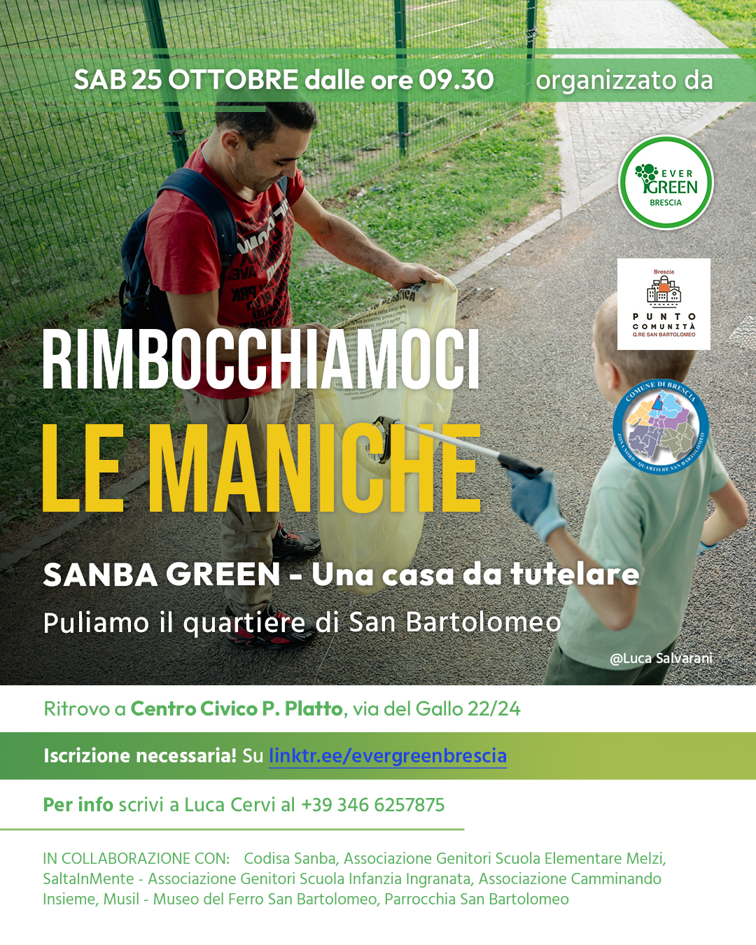 Invito per la cittadinanza a partecipare all’evento di raccolta rifiuti nel quartiere San Bartolomeo, Rimbocchiamoci Le Maniche SANBA GREEN.